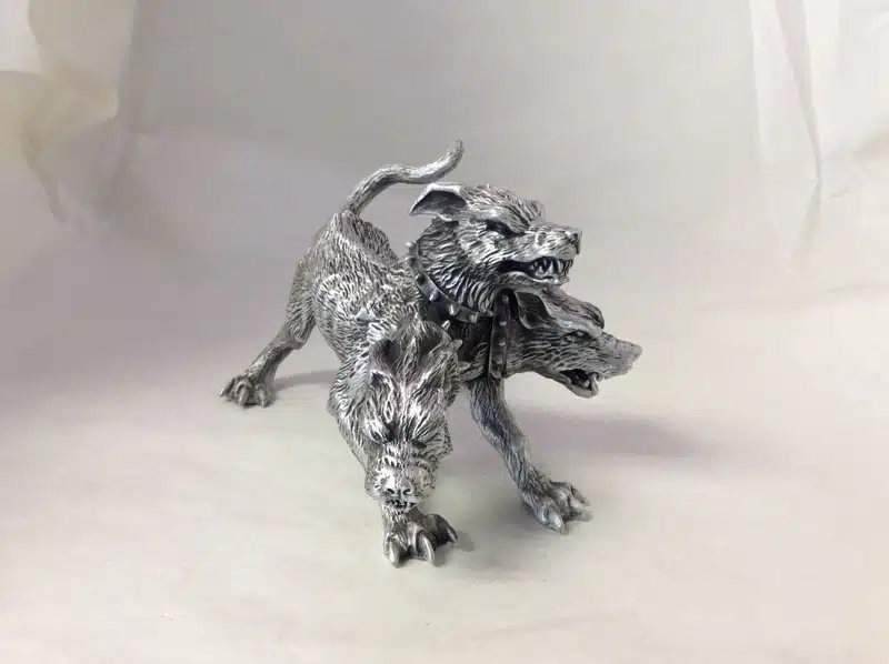 Panther and wolf, mounted to pewter surface. No exact size, between 3-5″. Antique pewter finish.
