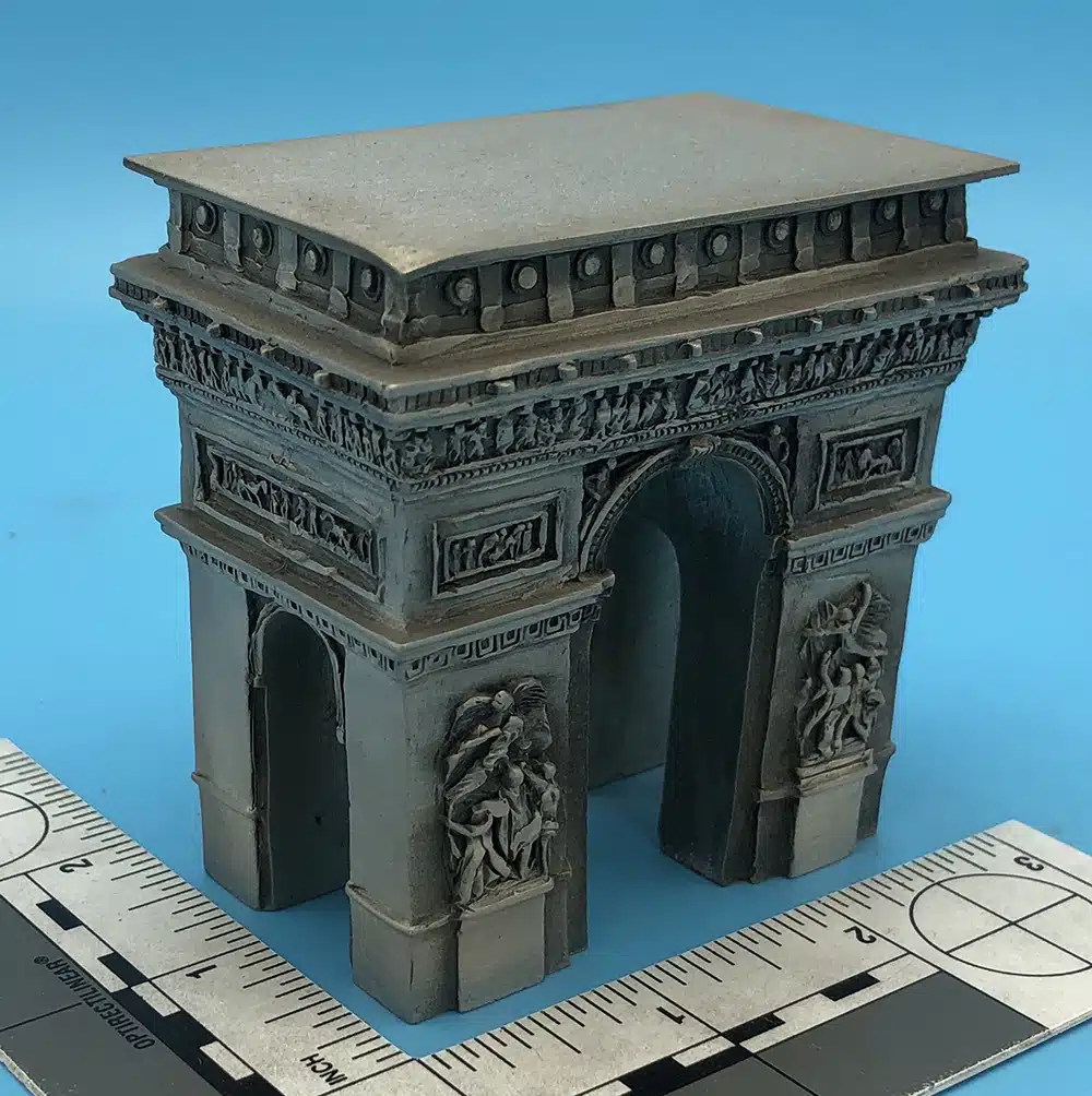 New York Hotel 5″h. Mounted to slant front black wood base and custom plate artwork. Antique pewter finish.